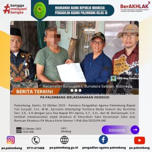 Palembang | Kamis, 02 Oktber 2025 – Panitera Pengadilan Agama Palembang Bapak Yuli Suryadi, S.H., M.M., dengan didampingi Panitera Muda Hukum Ibu Nurlinda Sari, S.E., S.H. dengan Juru Sita Bapak Efri Aprita, S.T., S.H., dan M. Barliansyah, S.H. kembali melaksanakan objek eksekusi di Kelurahan Sako Kecamatan Sako atas Permohonan Bantuan Eksekusi dari Pengadilan Agama Muara Enim Nomor 1/Pdt.Eks/2025/PA.ME.