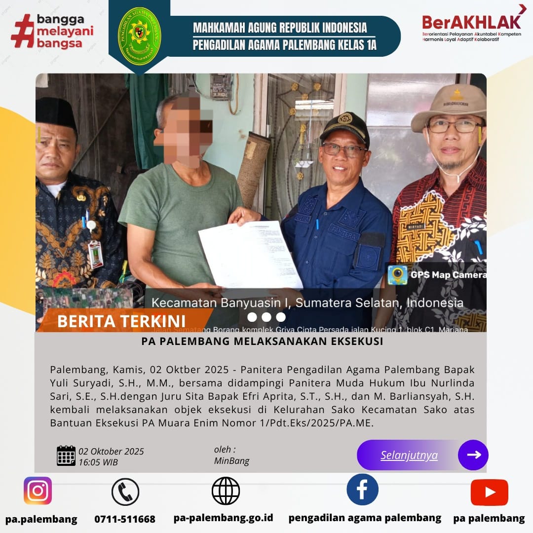 Pengadilan Agama Palembang terus berkomitmen melaksanakan semua proses eksekusi sesuai prosedur dengan transparan, adil, integritas, dan profesional.