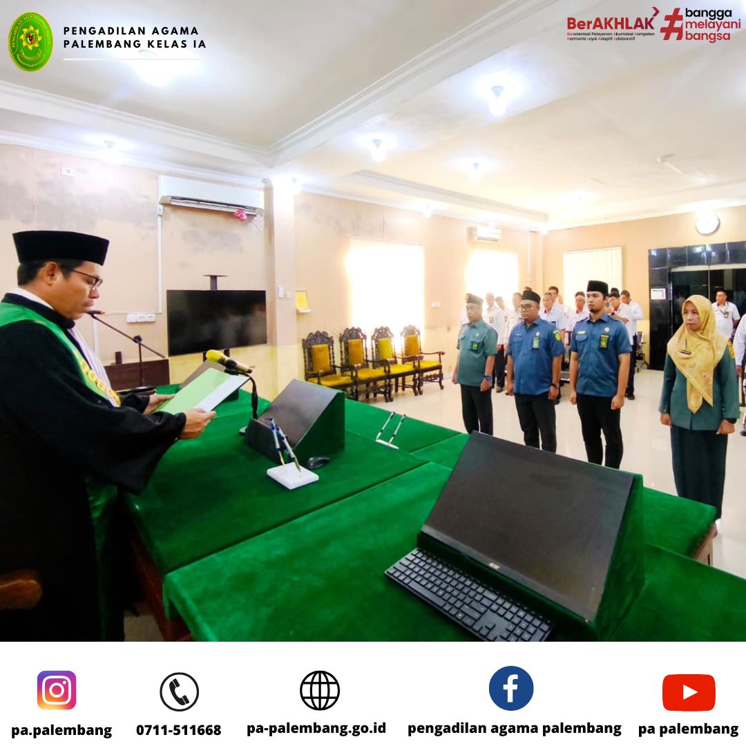 Acara dimulai dengan penghormatan terhadap negara dengan menyanyikan lagu kebangsaan Indonesia Raya dan Hymne Mahkamah Agung, serta pembacaan Surat Keputusan Ketua Mahkamah Agung. Acara dilanjutkan dengan prosesi pengambilan sumpah jabatan oleh para pejabat yang dilantik disertai dengan penandatanganan Berita Acara Sumpah dan Pakta Integritas sebagai wujud komitmen mereka terhadap integritas dan profesionalisme dalam menjalankan tugas. Alhamdulillah Kegiatan pelantikan berjalan dengan lancar dan khidmat. Selanjutnya kata sambutan dari Ketua Pengadilan Agama Palembang berupa ucapan selamat atas jabatan barunya juga semoga dapat membawa perubahan untuk Pengadilan Agama Palembang, dan mengingatkan pentingnya tanggung jawab serta integritas dalam menjalankan tugas di lingkungan peradilan agama. Alhamdulillah, seluruh rangkaian acara berlangsung dengan khidmat dan lancar.