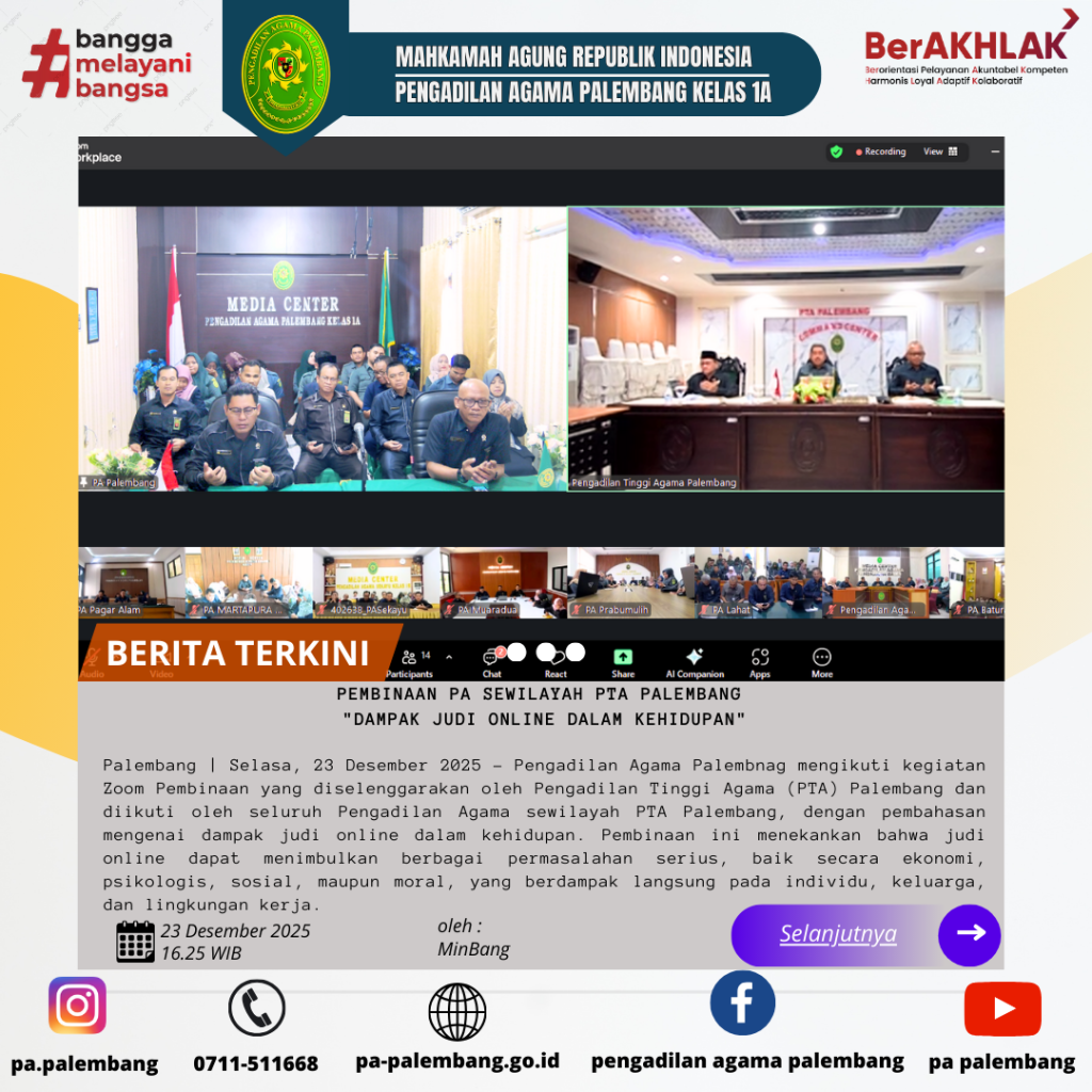 Palembang | Selasa, 23 Desember 2025 – Pengadilan Agama Palembnag mengikuti kegiatan Zoom Pembinaan yang diselenggarakan oleh Pengadilan Tinggi Agama (PTA) Palembang dan diikuti oleh seluruh Pengadilan Agama sewilayah PTA Palembang, dengan pembahasan mengenai dampak judi online dalam kehidupan. Pembinaan ini menekankan bahwa judi online dapat menimbulkan berbagai permasalahan serius, baik secara ekonomi, psikologis, sosial, maupun moral, yang berdampak langsung pada individu, keluarga, dan lingkungan kerja.