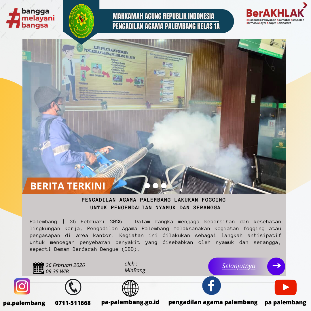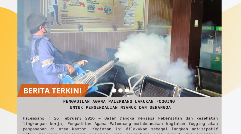 Palembang | 26 Februari 2026 – Dalam rangka menjaga kebersihan dan kesehatan lingkungan kerja, Pengadilan Agama Palembang melaksanakan kegiatan fogging atau pengasapan di area kantor. Kegiatan ini dilakukan sebagai langkah antisipatif untuk mencegah penyebaran penyakit yang disebabkan oleh nyamuk dan serangga, seperti demam berdarah dengue (DBD).