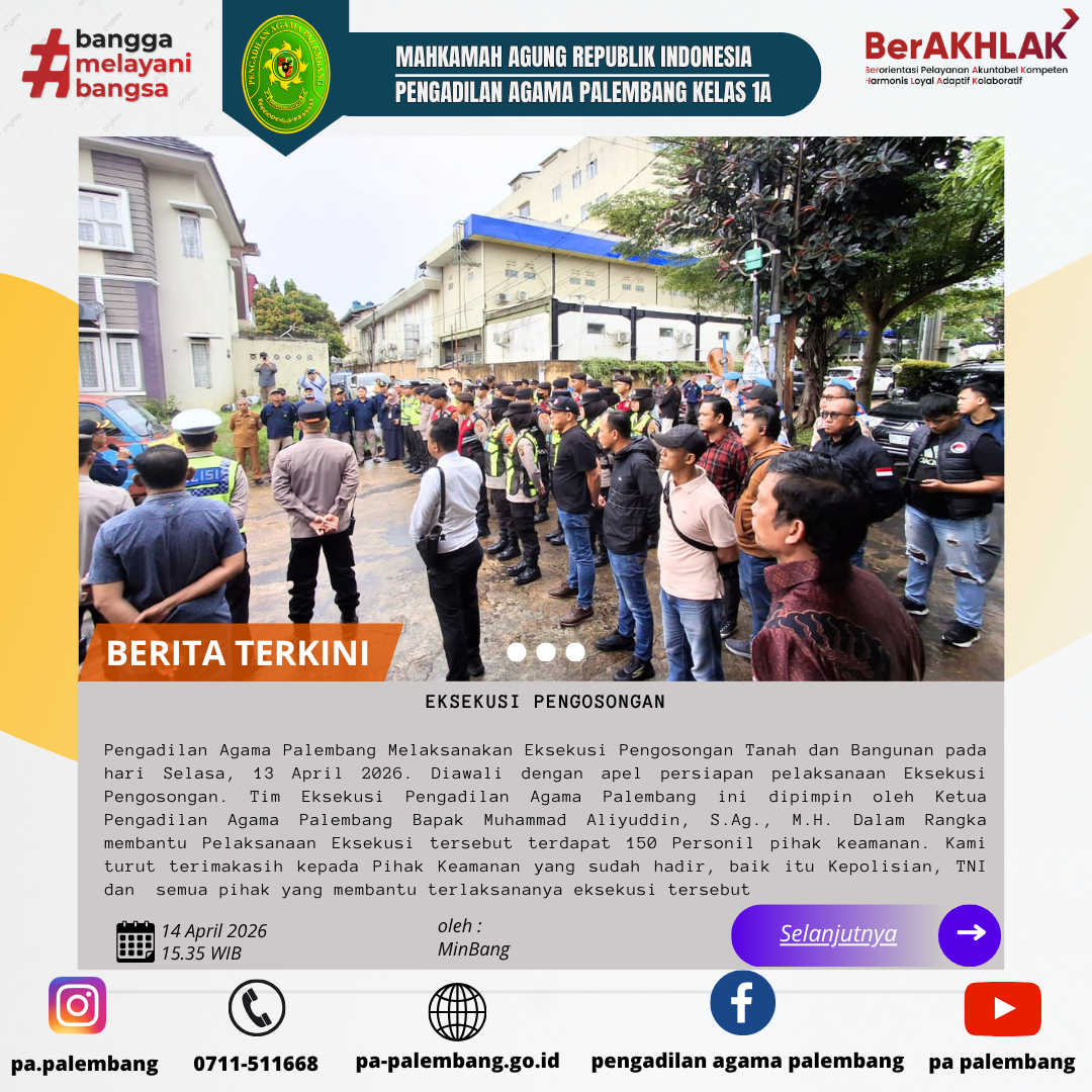 Pengadilan Agama Palembang Melaksanakan Eksekusi Pengosongan Tanah dan Bangunan pada hari Selasa, 14 April 2026. Diawali dengan apel persiapan pelaksanaan Eksekusi Pengosongan. Tim Eksekusi Pengadilan Agama Palembang ini dipimpin oleh Ketua Pengadilan Agama Palembang Bapak Muhammad Aliyuddin, S.Ag., M.H. Dalam Rangka membantu Pelaksanaan Eksekusi tersebut terdapat 150 Personil pihak keamanan. Kami turut terimakasih kepada Pihak Keamanan yang sudah hadir, baik itu Kepolisian, TNI dan semua pihak yang membantu terlaksananya eksekusi tersebut.